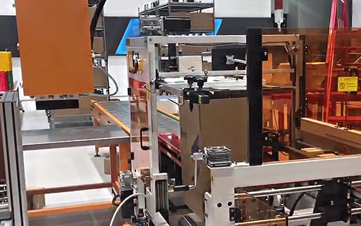 自動拆箱機自動完成開箱、成形、下底折葉折曲。并現(xiàn)時完成下部分膠帶粘貼,將疊成紙板的箱板自動打開,箱子底部按一定程序折合,并用膠帶密封后輸送給裝箱機的專用設(shè)備。