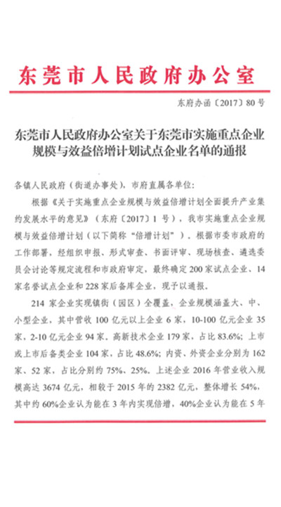 根據(jù)《關(guān)于實(shí)施重點(diǎn)企業(yè)規(guī)模與效益倍增計(jì)劃 全面提升產(chǎn)業(yè)集約發(fā)展水平的意見》(東府〔20171號),以及《關(guān)于東莞市實(shí)施重點(diǎn)企業(yè)規(guī)模與效益倍增計(jì)劃試點(diǎn)企業(yè)名單的通報(bào)》(東府辦函〔201780號),經(jīng)過前期的書面申報(bào)、形式審查、書面評審、現(xiàn)場核查、專家評審、材料審計(jì)等規(guī)定流程和市政府審定,廣東匯興精工智造股份有限公司(股票代碼:839258)憑借17年來在智能裝備領(lǐng)域的核心科技以及高成長性,成功入選為東莞市實(shí)施重點(diǎn)企業(yè)規(guī)模與效益倍增計(jì)劃(以下簡稱“倍增計(jì)劃”)200家試點(diǎn)企業(yè)之一。