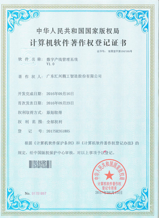 近日,匯興智造喜報(bào)頻傳,繼之前獲得多項(xiàng)發(fā)明專利和商標(biāo)注冊(cè)之后,又參與國(guó)家標(biāo)準(zhǔn)的起草,如今再次獲得五項(xiàng)國(guó)家版權(quán)局計(jì)算機(jī)軟件著作權(quán)登記證書,它們分別是產(chǎn)品數(shù)字化追溯系統(tǒng)、車間生產(chǎn)工藝參數(shù)監(jiān)控系統(tǒng)、車間生產(chǎn)設(shè)備維護(hù)管理系統(tǒng)、生產(chǎn)績(jī)效考核管理系統(tǒng)和數(shù)字產(chǎn)線管理系統(tǒng)這五大軟件。匯興智造17年來(lái),精工制造各類智能自動(dòng)化生產(chǎn)線,擁有行業(yè)深厚的經(jīng)驗(yàn),在充分了解客戶的實(shí)際需求后,開發(fā)了產(chǎn)品數(shù)字化追溯系統(tǒng)等軟件,并取得相關(guān)著作權(quán)。其中,權(quán)利取得方式為原始取得,權(quán)利范圍為全部權(quán)利。
