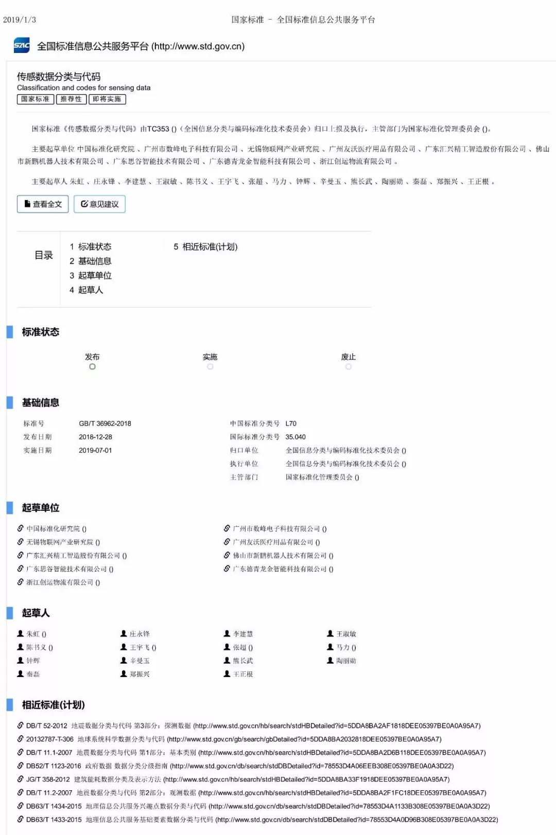 1月10日,國家市場監(jiān)督管理總局、國家標準化管理委員會發(fā)布了《中華人民共和國國家標準公告》2018年第17號。由匯興智造參與起草的國家標準《傳感數據分類與代碼》獲準公布,并將于2019年7月1日開始實施。